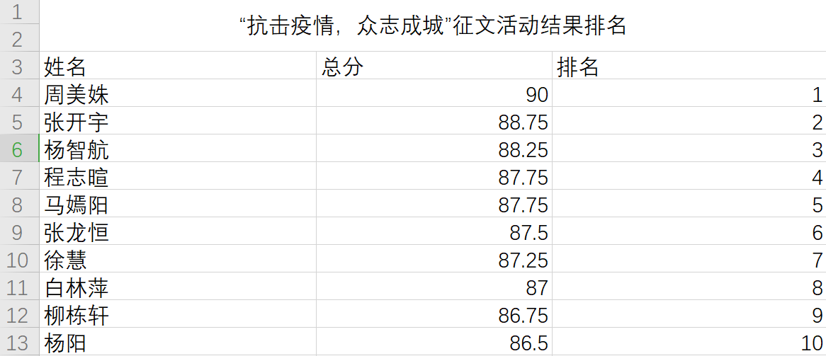 在这场线上活动当中,同学们积极参加,用文字讲述了一个又一个疫情期间那些感人的文章。通过这些优秀的作品,我们看到了无私奉献自愿请命到社区的志愿者、挨家挨户普及防疫知识的调查人员、清洁公共空间卫生的消杀人员等等。在同学们的文章当中,主人公有的是自己,有的是别人,但是在这场抗击疫情当中,我们每个人都是主人公。最后,由评委为参赛作品打分,周美姝、张开宇、杨智航获得了前三名。