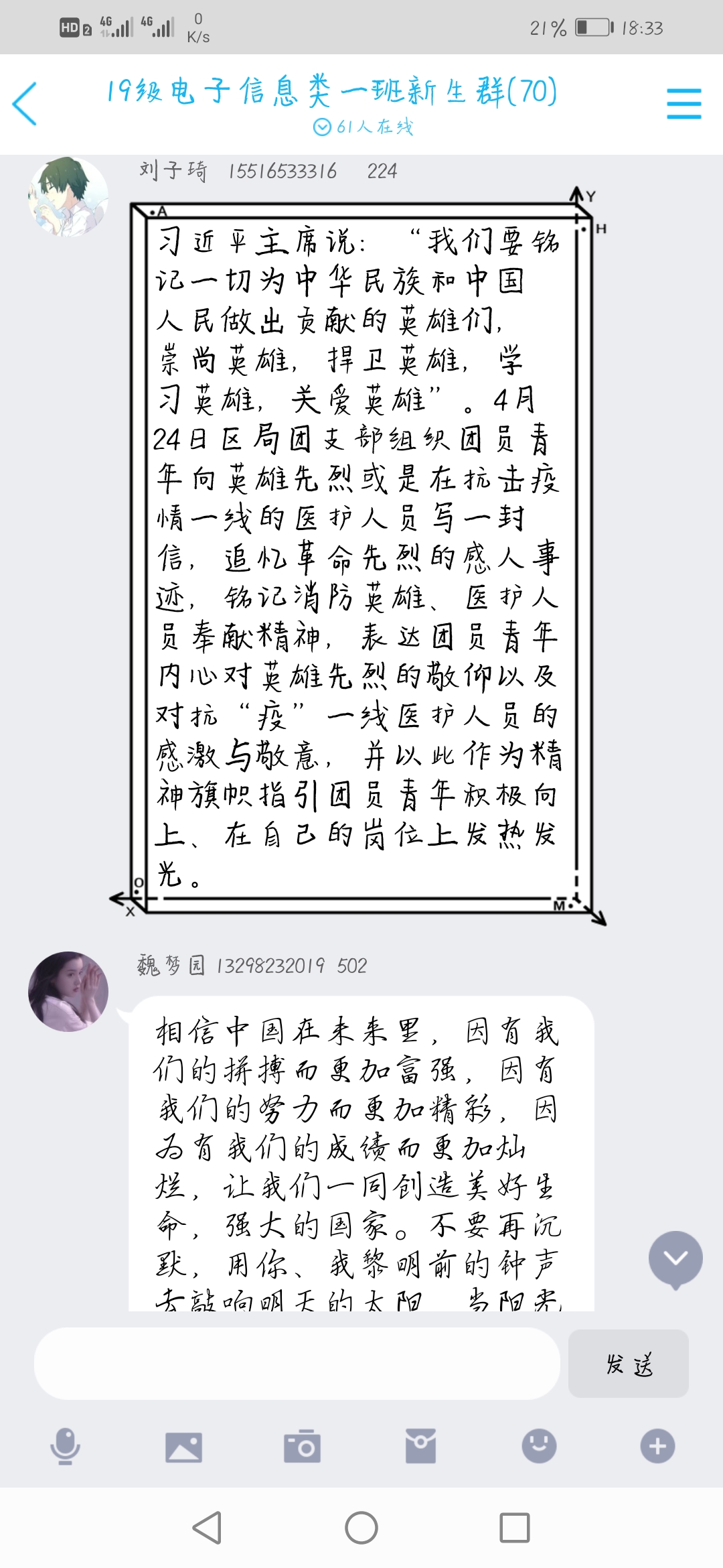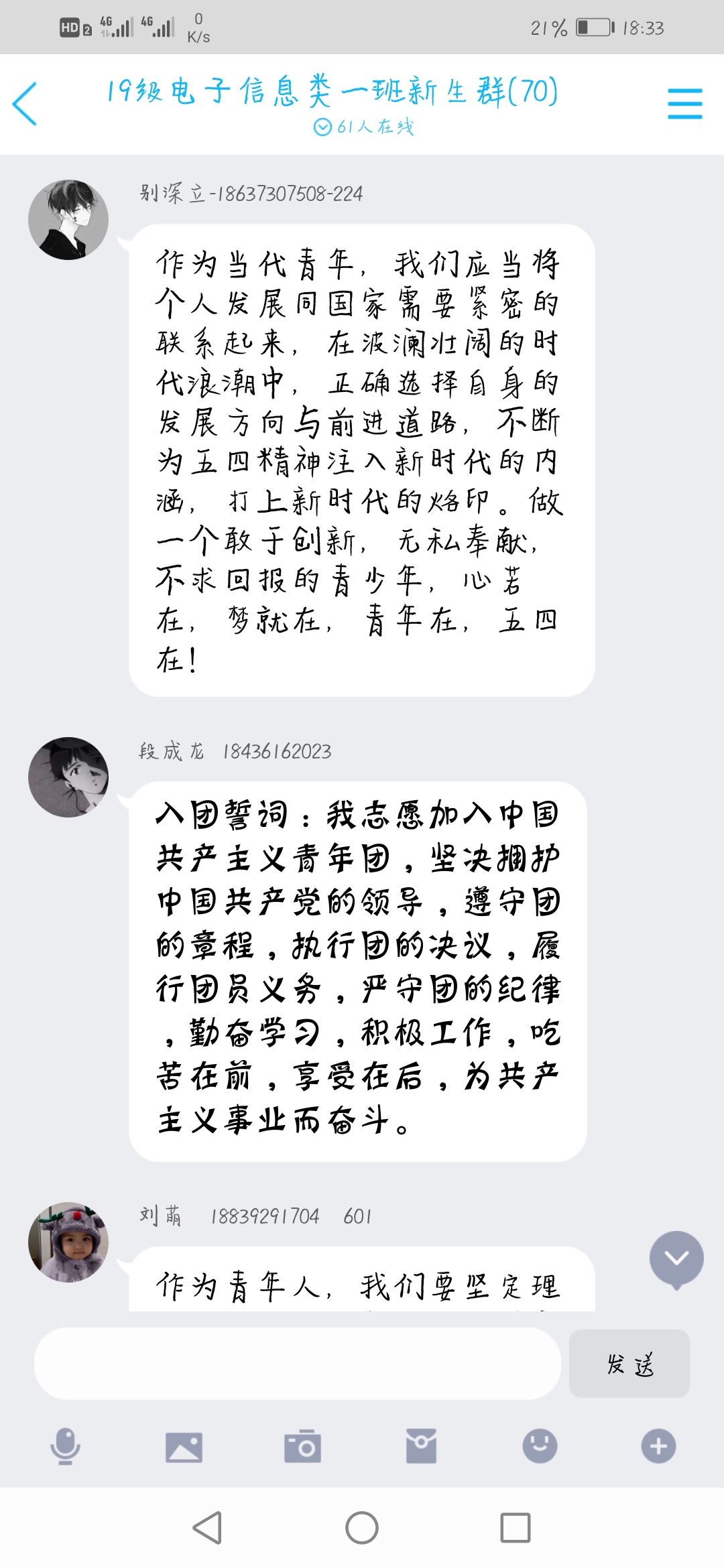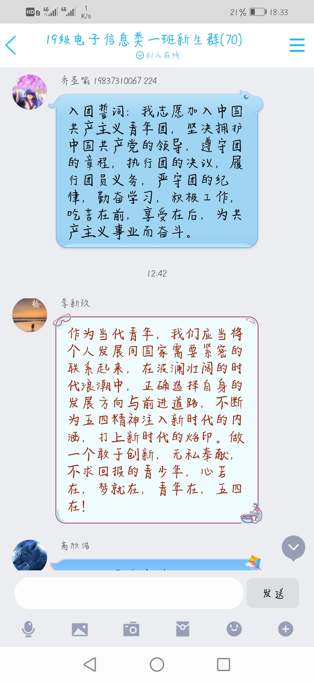 团日活动在庄严的线上入团仪式中拉开帷幕,同学们庄重宣誓要用实际行动来践行好入团誓词的庄严承诺,证明自己无愧于共青团员的光荣称号。接着全体同学共同观看新团员入团宣誓,新团员神情肃穆,表示自己能加入中国共产主义青年团,既是一份荣光,更是一种责任与追求。然后由老团员进行重温入团誓词仪式,以寝室为单位,由寝室长组织同学庄严手写入团宣誓词。最后全体成员起立齐唱国歌、团歌,并在寝室长的组织下录制视频,此次团日活动就在同学们的朗朗歌声中落下了帷幕。