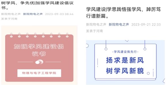 通过微信公众号推送“树学风、争先优,加强学风建设倡议书”、“学思践悟强学风,踔厉笃行谱新篇”学风建设文章,向广大学生宣传学院学风建设活动,发出加强学风建设倡议,鼓励同学们积极参与其中,形成良好风气。