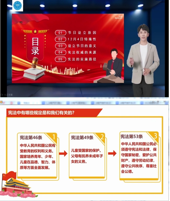 为增强大学生对于宪法的理解,从而自发树立法治意识,自觉守法。各班利用课余时间学习宪法相关视频,包括动漫和真人知识普及型,说明了宪法中有哪些权利和义务与我们相关,还通过动漫直观展示了宪法如何贯穿于我们的一生,围绕我们生活的方方面面发挥作用。宪法规定了我们作为公民的义务,也给予了我们相应的权利,视频中提到的宪法实施路径有助于学生保障自己的合法权益。视频通过展示违法案例,让同学们感受宪法在生活中的应用,并对宪法的条例规定有更深刻的理解。
