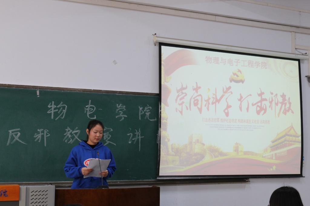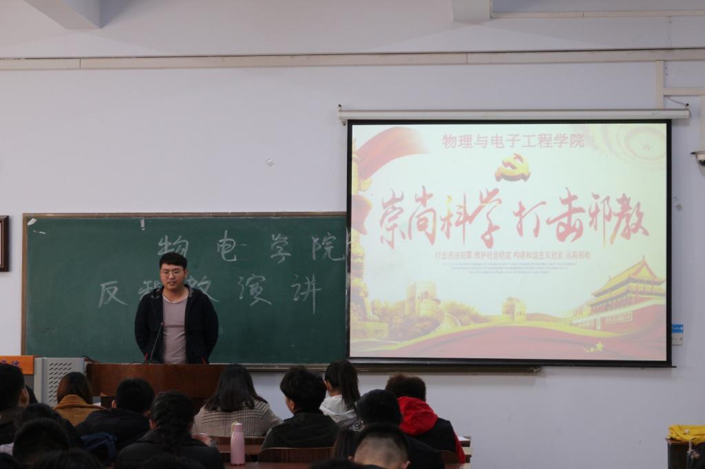 为进一步弘扬社会主义核心价值观,引导大学生树立马克思主义民族观、宗教观,共同抵制邪教,建设安全稳定的和谐校园,太阳集团网站8722于11月18日下午3:00在A05-203教室举办了反邪教演讲比赛,由杨海燕、杨自豪、孟傲华等同学担任评委,牛静飞同学担任主持人。