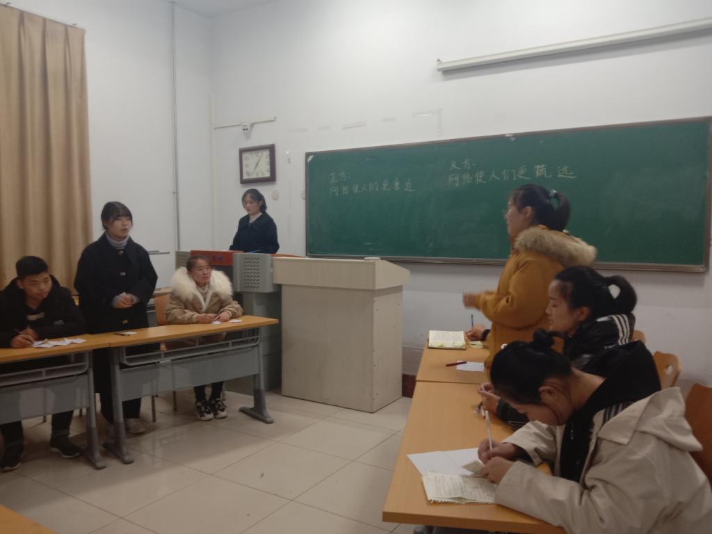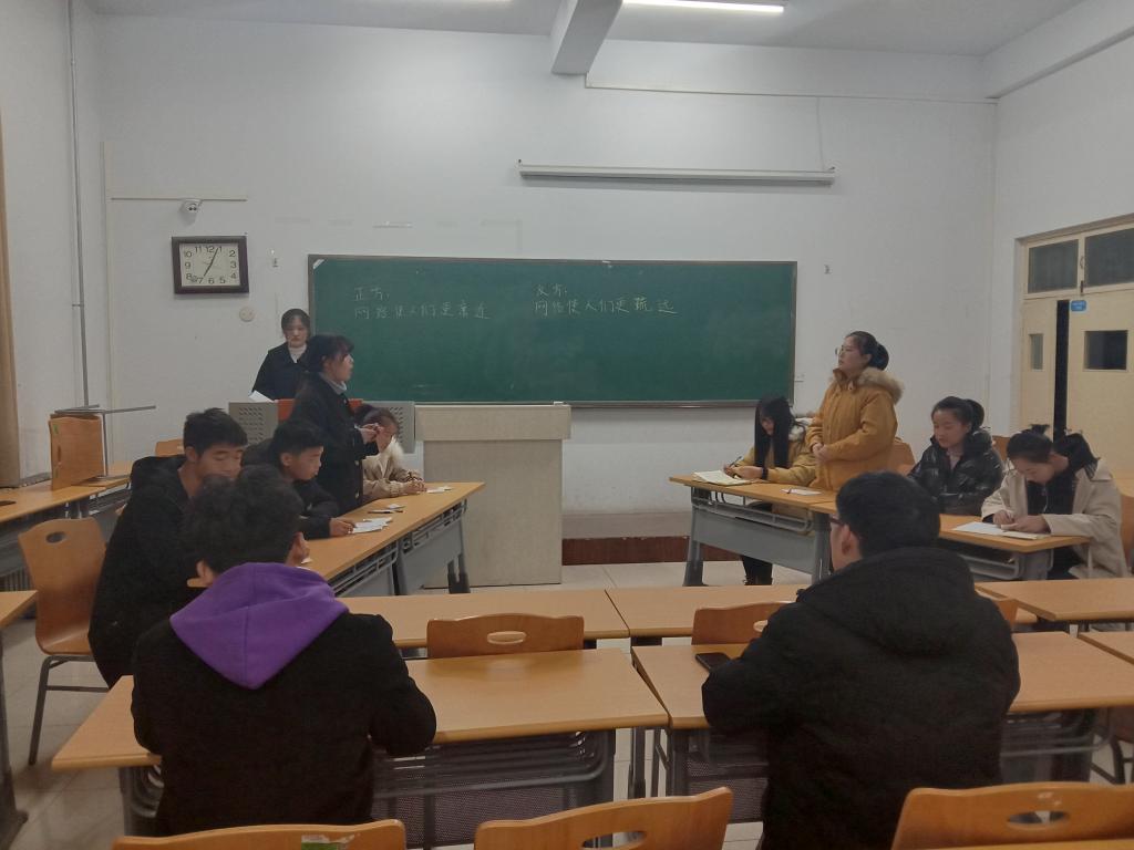 为了提高同学们的辩论水平、语言表达能力和逻辑思维能力,体现大学生风华正茂的精神状态。太阳集团网站8722于12月8日19:00在A05-206举办辩论赛。此次比赛由18级辩论队队长谢斌同学担任评委,田乐乐同学担任主持人。