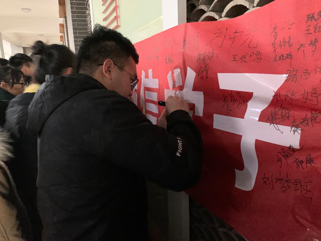 活动开始后,19级各班同学在纪检部成员的带领下井然有序地排着队伍,在写着“树诚信考风,做诚信学子”标语的横幅上认真地签下自己的名字,以表达自己在即将到来的期末考试中要做诚信考生的决心。横幅空白处慢慢地被填满,同学们签下的每个名字正代表着一个个承诺。横幅上的字也时刻提醒着同学们要诚信应考,拒绝舞弊,树立一个良好的考生形象。