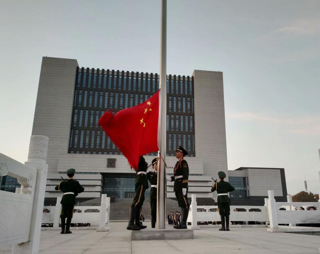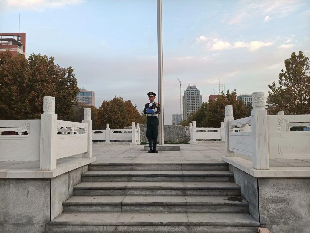 晨曦微露,国旗广场上早已汇聚了众多的身影,整齐的列队在国旗台下。迎着清晨的第一缕阳光,国旗护卫队成员穿着军装,迈着整齐的步伐进入升旗场地,自此,升国旗仪式开始了。慷锵有力的《义勇军进行曲》在拂晓的衬托下回荡在国旗广场上,回荡在每位学生的耳边。伴随着歌声,那面鲜艳的五星红旗缓缓升起,场下所有的学生满怀着对祖国的热爱和崇高的敬意,向着国旗行注目礼。曲毕,红旗也恰好临近顶端,曙光照耀下,丝丝寒风中,五星红旗傲然的迎风飘扬着。之后的演讲中,演讲人杜川同学以“爱国情怀”为主题表达了对祖国的热爱之情,展现出新时代青年对实现中华民族伟大复兴的远大抱负。