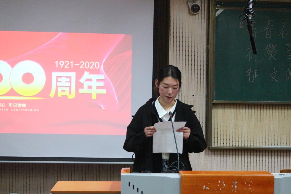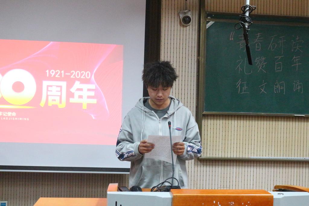 此次活动总体分为线上征文活动和线下朗诵比赛两部分。活动内容一经推出,短短几天,负责线上征文的成员们就接连收到许许多多的文稿,犹可见同学们对此次活动的热情。经过评委们的层层筛选,最终选定了15篇文稿参加线下朗诵比赛。台上,朗诵者们用饱含爱国之意的声音诵读着自己的文稿,台下,没有一丝多余之音,所有的同学们都在认真聆听着台上的诵读,每到精彩之处,同学们还会闭上眼睛,在朗诵者的声音带领下,想象着党的百年历史征程。直到比赛结束,同学们依旧沉浸其中,甚至都忘了给予朗诵者掌声鼓励。