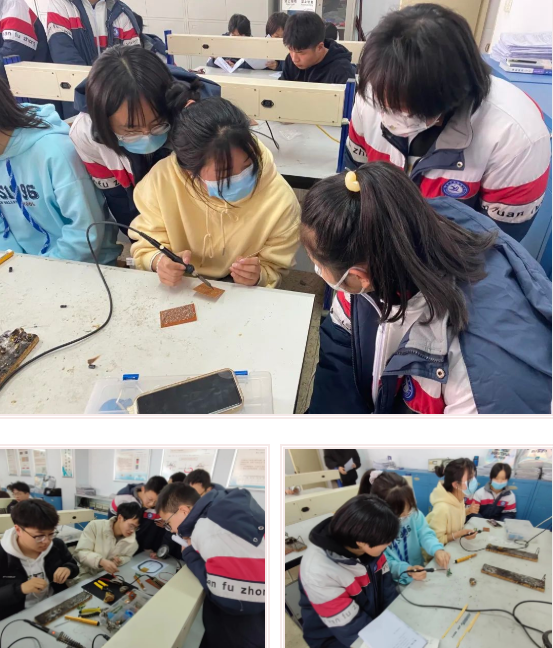 接下来,同学们又来到电子工艺实验室,他们认真聆听老师的讲解,还与tyc8722太阳集团物理系的大哥哥、大姐姐们一起进行电路焊接的实验操作。
