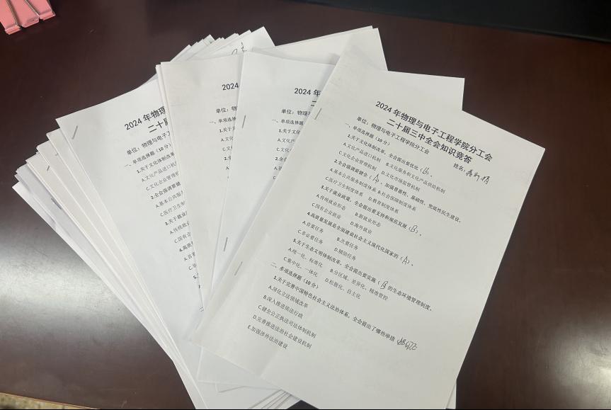 本次活动的答题环节一共设置了填空题、选择题、简答题,全体职工踊跃作答,纷纷展现自己的学习成果,展现了物电学院教职工严肃认真的工作作风。本次主题党日活动,是对物电学院教师近期学习成果的一次检验,有助于将党的二十届三中全会精神学深悟透,同时也查找出了在理论学习中的短板弱项,为今后的学习明确了努力方向。