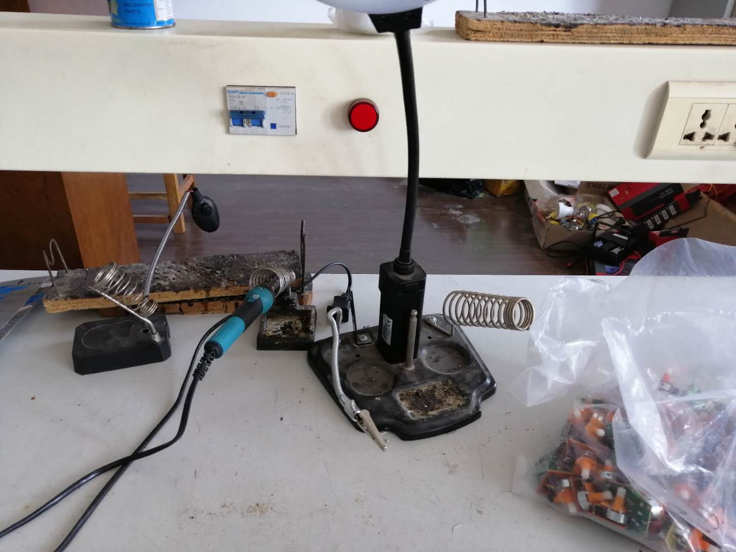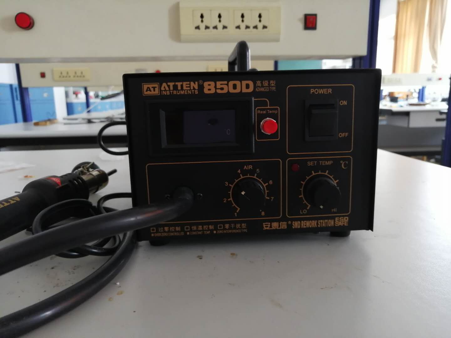 电子产品工艺实验室主要仪器设备有实训台、热风插拔器、高速台钻、恒温焊台、双面雕刻机、转印机、视频毫伏表、双路稳压稳流电源、频率特性测试仪等。本实验室可以完成烙铁头整理及焊接技术练习、元器件整形焊接练习、拆焊练习、常用电子元器件检测、印刷线路电路板焊接等实训项目。