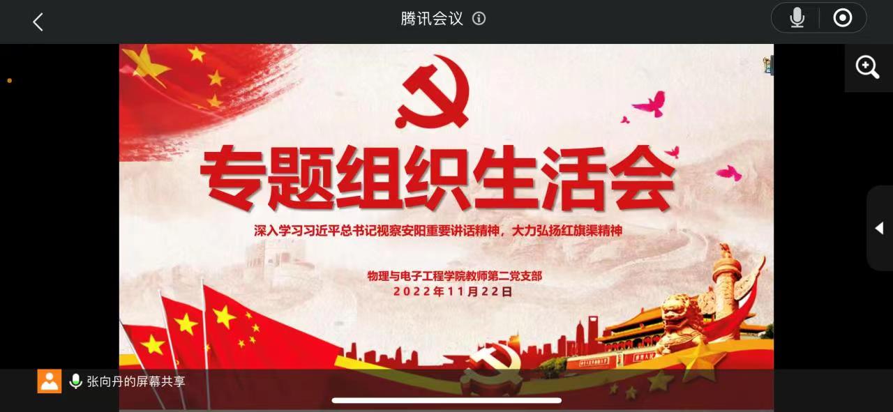 根据学校文件要求,11月22日下午,太阳集团网站8722教师第二党支部召开线上专题组织生活会,深入学习习近平总书记视察安阳重要讲话精神。组织生活会由教师第二党支部书记张向丹主持,副校长张占祯以普通党员身份参加了本次线上专题组织生活会。